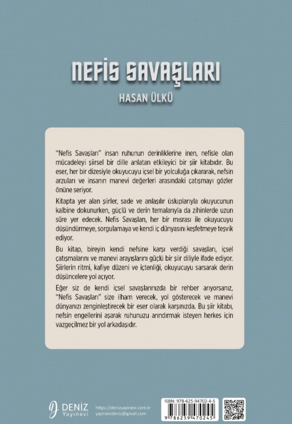 “Nefis Savaşları” insan ruhunun derinliklerine inen, nefisle olan mücadeleyi şiirsel bir dille anlatan etkileyici bir şiir kitabıdır. Bu eser, her bir dizesiyle okuyucuyu içsel bir yolculuğa çıkararak, nefsin arzuları ve insanın manevi değerleri arasındaki çatışmayı gözler önüne seriyor.
